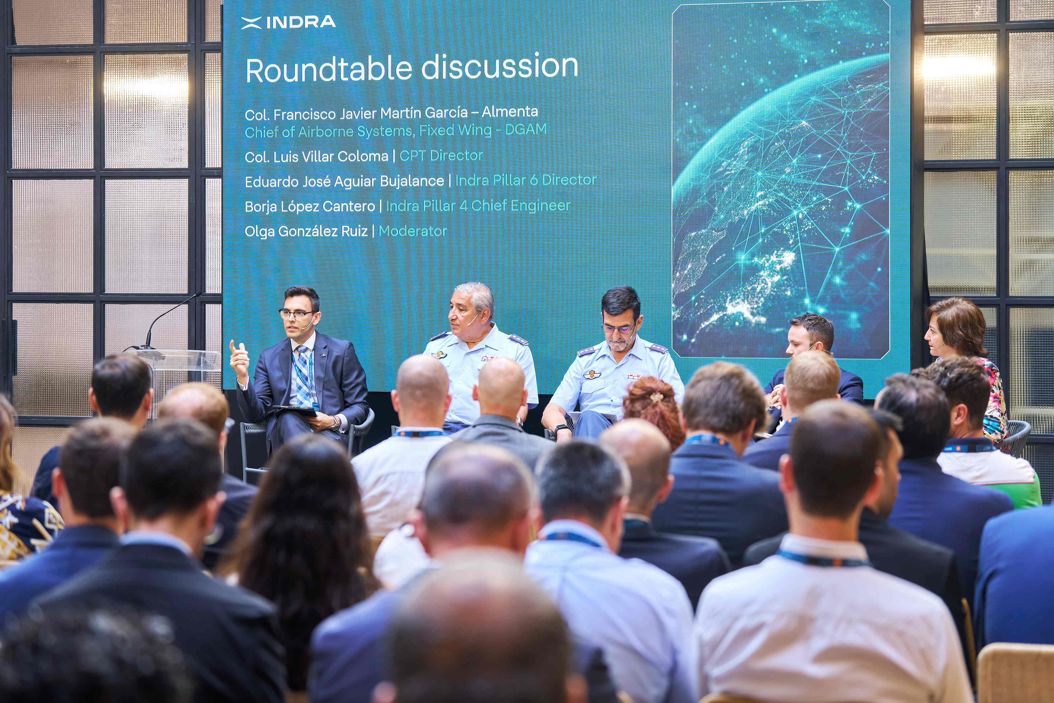 Following these remarks, Colonel Luis Villar, Director of the Combined Project Team for Spain; Colonel Francisco Javier Martín García-Almenta, Head of the Fixed-Wing Office in DGAM’s Subdirectorate General for Programs; Eduardo Aguiar, Head of the NGWS/FCAS Sensor Pillar at Indra; and Borja López, Chief Engineer of the Combat Cloud Pillar at Indra, participated in a panel discussion moderated by Olga González, Project Manager for NGWS/FCAS. They discussed the importance of innovation and the valuable contributions of the 14 entities involved in these 17 technological projects, highlighting the immense value of incorporating dual-use civil technologies into the defense sector.