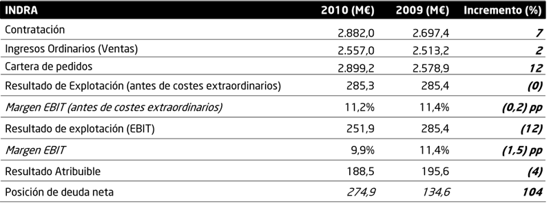 Tal como avanzó la compañía el pasado 24 de enero en la presentación de objetivos para este año, Indra ha finalizado el ejercicio 2010 cumpliendo todos los objetivos anunciados a principios del pasado año, destacando el comportamiento altamente favorable de la actividad internacional, tanto en ventas como en contratación.
