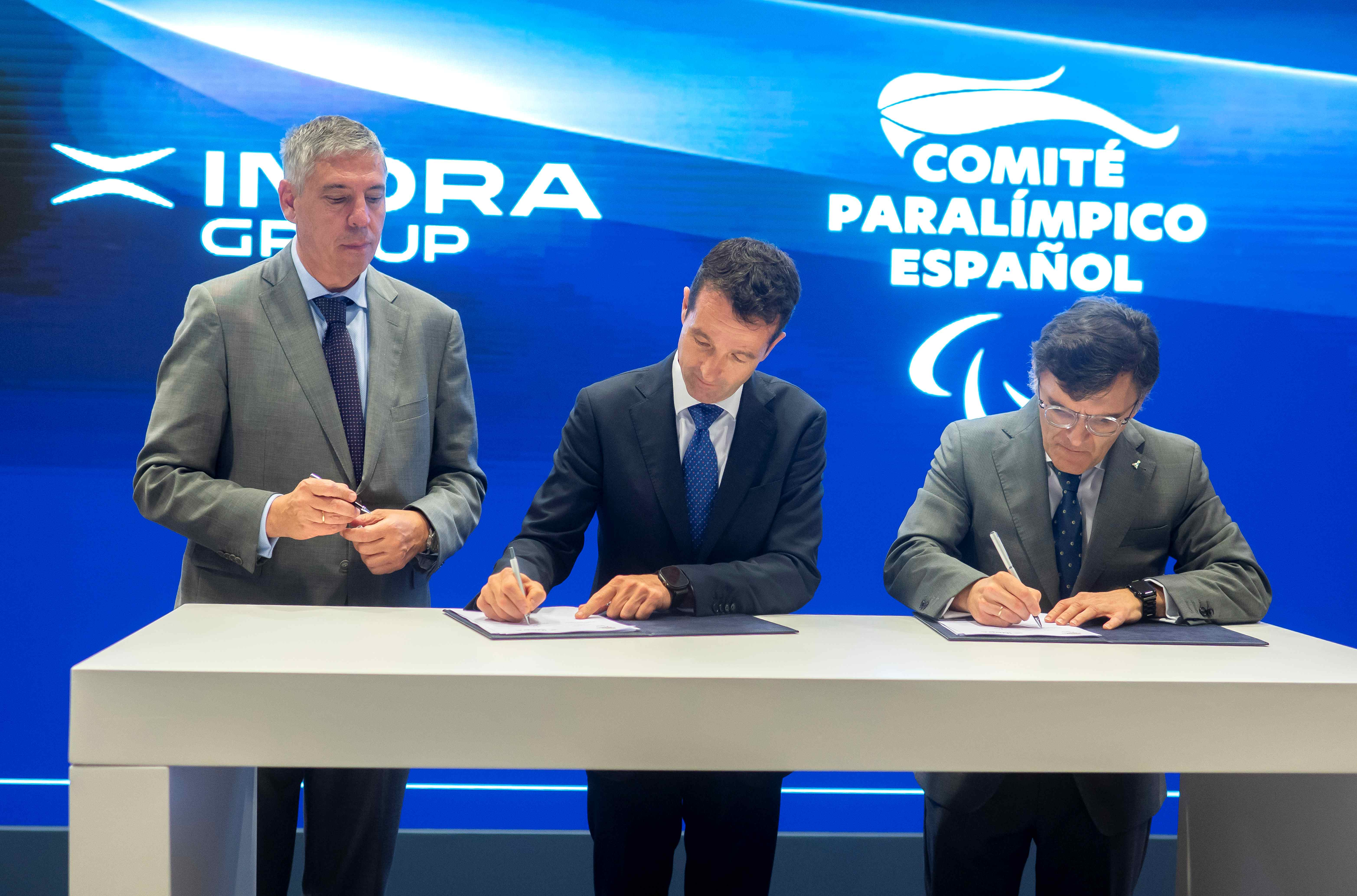 Ángel Escribano, presidente ejecutivo de Indra Group; José Vicente de los Mozos, consejero delegado de Indra Group; y Alberto Durán López, presidente del Comité Paralímpico Español, han firmado el acuerdo durante un acto celebrado en el recinto ferial Ifema en Madrid.