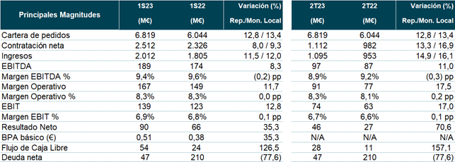 Los ingresos aumentaron un 11,5% en los primeros seis meses de 2023, acelerando su crecimiento hasta un 14,9% en el segundo trimestre de 2023 vs mismo periodo de 2022: destaca el fuerte crecimiento en el trimestre de Defensa (subió un 48,7%) y Tráfico Aéreo (17,4%)