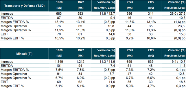 - El Margen EBIT de Transporte & Defensa en los seis primeros meses del año se colocó en el 10,5% frente al 10,2% del primer semestre en 2022. El Margen EBIT en el segundo trimestre de este año fue del 9,7% en comparación con el 10,6% del mismo trimestre el año anterior, afectado por la resolución del contrato del anterior consejero delegado (4 M€).