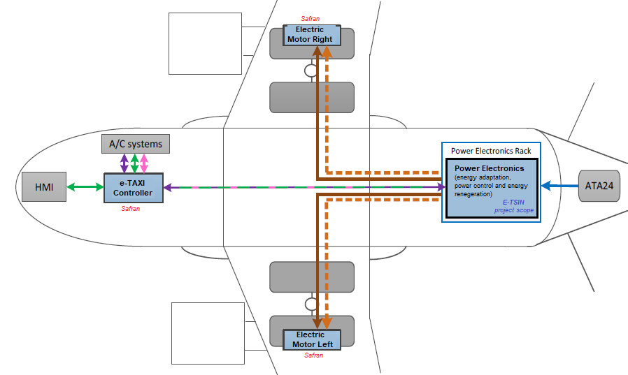 Este convertidor será integrado a futuro en un avión comercial (tipo A320) como parte del sistema eléctrico asociado al nuevo sistema de aterrizaje con tecnología eléctrica. Este nuevo sistema permitirá el movimiento del avión en tierra (fase de “taxi”) a través de unos motores eléctricos alojados en las ruedas del avión, en vez de tener que encender los motores principales (de combustión) del avión, lo cual permitirá reducir el consumo de combustible, reducción de las emisiones de las emisiones contaminantes (COx, NOx) y reducción del ruido acústico en las inmediaciones de los aeropuertos. Este nuevo sistema o aplicación es conocida como e-TAXI (taxi eléctrico en aeronaves).